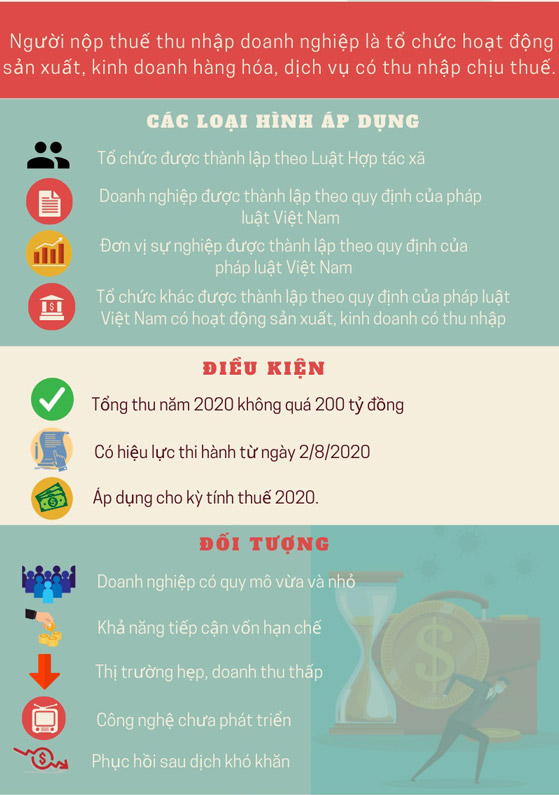 3.1 Giảm 30% thuế thu nhập doanh nghiệp phải nộp của kỳ tính thuế thu nhập doanh nghiệp năm 2020 đối với trường hợp doanh nghiệp có tổng doanh thu năm 2020 không quá 200 tỷ đồng.